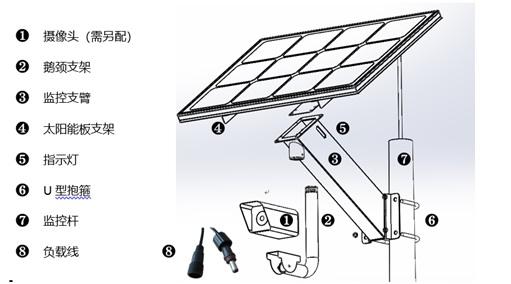①摄像头插好内存卡以及流量卡,⑧负载线穿过②鹅颈支架,与摄像头供电插好,固定好①摄像头