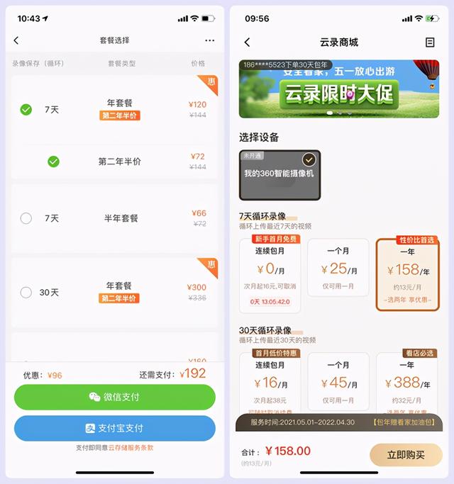 智能摄像机拍摄的视频无非就两种储存方式,要么储存在TF卡中,要么储存在云平台上。相比之下,固然是把视频上传到云平台储存会更加安全,如果把视频储存在TF卡中,那么闯入者一旦把摄像机带走就啥证据都没了。所以使用智能摄像机必然要开通云储存服务,来比较下两个品牌使用云储存的成本,以最短的7天循环储存为例,萤石开通一年套餐可获第二年半价优惠,这样算下来每月费用为10.67元,360开通一年套餐费用为158元,算下来每月是13.17元,相比之下,360要比萤石略贵一下,不过相差不大,就2个包子钱,可以忽略不计。