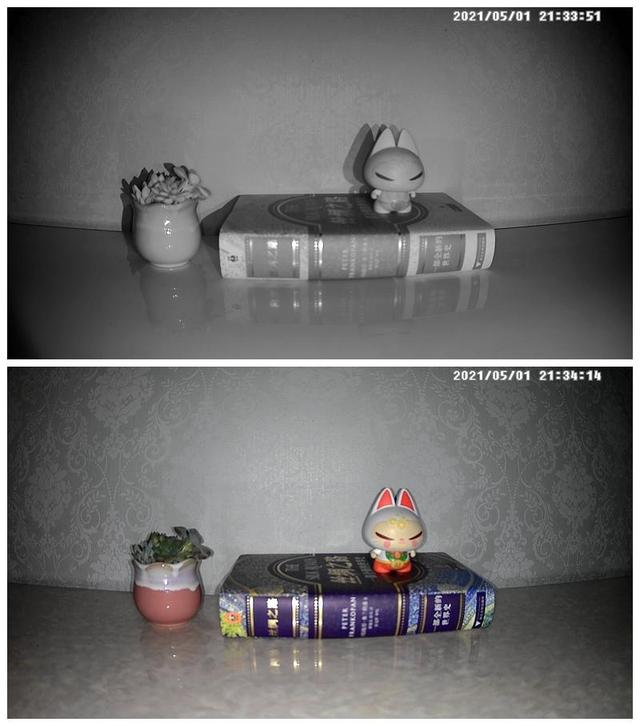 再来看看360 7C的夜视效果,在普通状态下和萤石C6WI一样呈现黑白画面,不过画质略好于萤石C6WI,这点区别还是比较明显的,这点360 7C的f/1.6大光圈有很大功劳。360 7C还有一个很大的惊喜,它具有全彩夜视功能,可以实现在黑暗环境下看到全彩画面,这要得益于360 7C的补光灯设计,在镜头旁设计有两个大功率LED补光灯,在全彩夜视模式下,当环境光线较暗时会自动开启补光灯,这样就可以显示彩色画面了,比起黑白画面真的要好太多了。