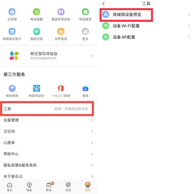 具体路径:打开手机萤石云视频软件,点击右下角“我的”--“工具”--“局域网设备预览”--点击“开始扫描”,就能自动搜索到同一局域网内摄像机,输入设备的用户名和密码,就可以对摄像机进行画面预览和回放。