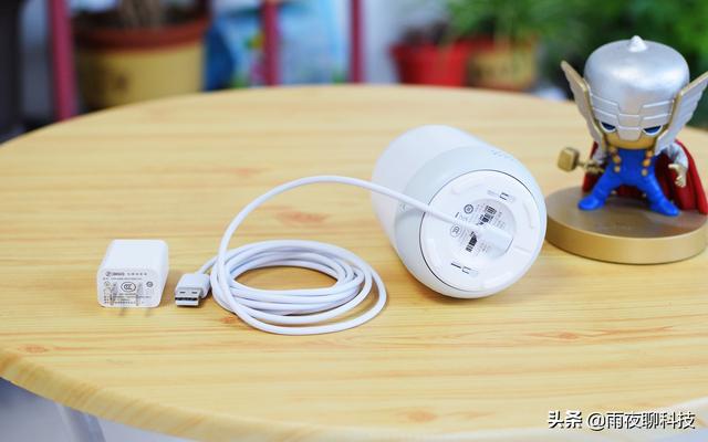配件方面包含一根约1.5米的充电线,标配5V1A的充电头;另外还配了一套墙面固定套装:一张打孔贴纸、三副塑料自攻丝以及固定底座
