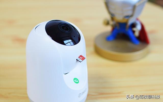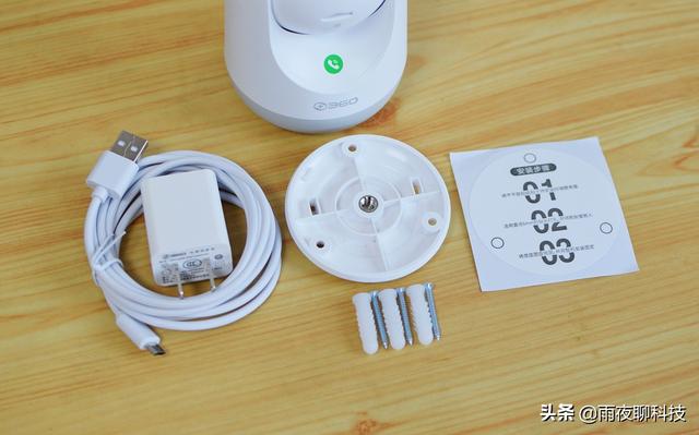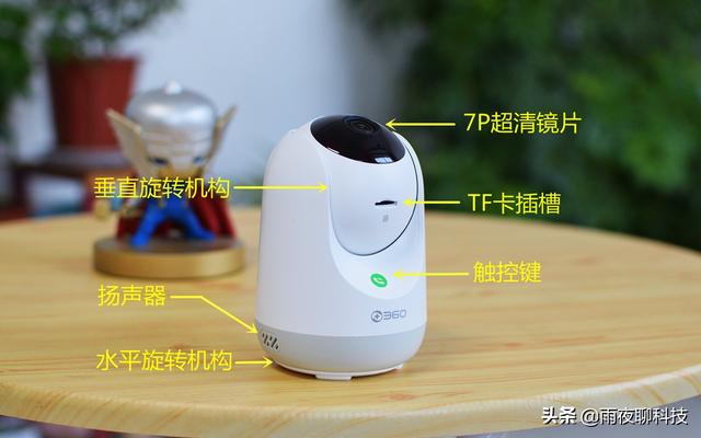 这款360智能摄像机配备了7P的镜头,最大支持分辨率为2560*1440(2.5K)、TF卡槽,水平、垂直转动机构以及一只触摸按键