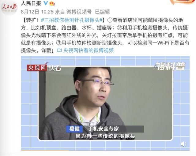 近日,人民日报官方微博发文“三招教你检测针孔摄像头”,相关话题和视频迅速登上热搜,引起网友广泛关注。该推文中提到,除了检查酒店房间陈设和发光装置外,另一个有效方式是利用360手机卫士等手机软件一键发现新型摄像头的踪迹。推文视频中,360手机安全专家葛健也详细介绍了360手机卫士“偷拍检测”功能的使用方法。