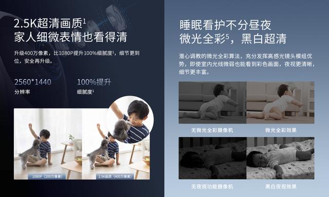 这款摄像机经典的无棱角设计耐看又实用,家有小朋友的话完全不用担心磕碰。机身轻便小巧,再加上超级无敌长的电源线,可以根据需要摆放在家里的任意地方。既然是超清版的摄像机,400万像素的镜头相当惊喜,画质达到2.5K,这个清晰度,连毛发都看得清清楚楚,人脸的微表情等也不在话下,足以捕捉孩子们的各种精彩瞬间。微光全彩功能在弱光下也能呈现全彩画面,夜间更有增强黑白超清夜视功能,细节也能看清。支持H.265编码,更加节省空间,这样的清晰度和流畅性,不管是看家、看护小孩和老人还是作为看店铺使用,都非常适合。
