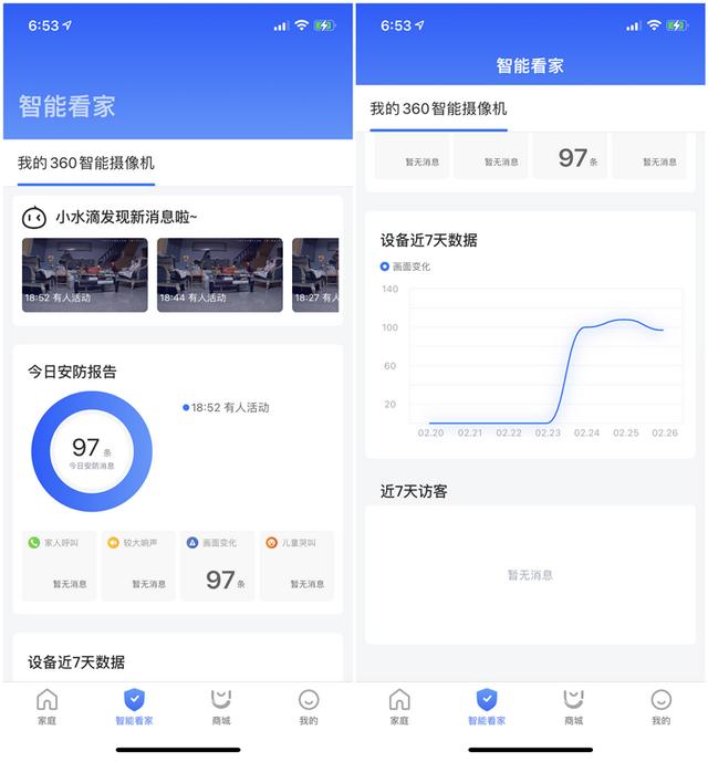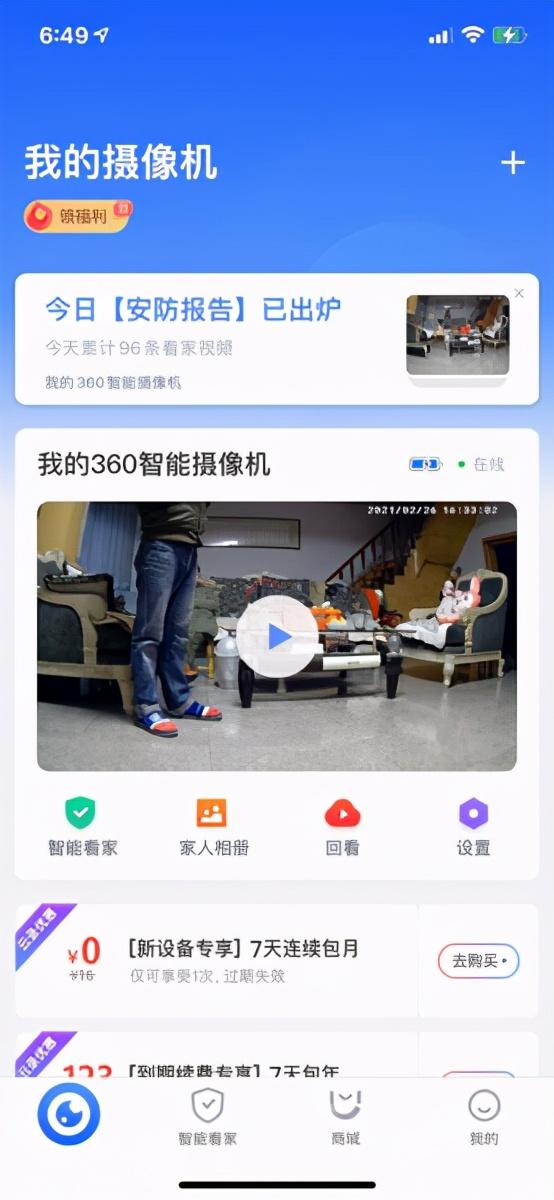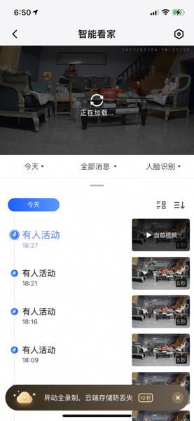 360摄像机的主页,占位面积最大的部分就是实时画面了!点入后可以看到摄像机录制的直播画面。另外它还带有智能看家的功能,该功能的运作机制是当画面里有任何变化时,它都会拍下5秒的变化画面片段。这样一来,360智能摄像机3C云台电池版并非24小时全天候都在录制,从一定程度上起到了增加续航的作用,如果想要24小时录制也可以通过调整APP设置实现,可以满足不同人群的需求。