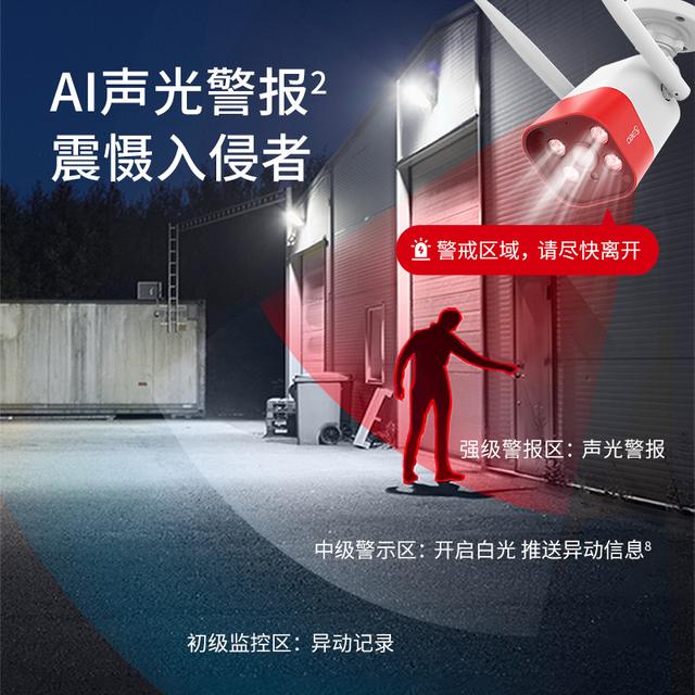 用户可在APP内设置三档警报区域,每档区域对应不同的预警方案,由外到内警报程度层层递增,当有人走进外层报警圈时,摄像机只会将异动信息记录在APP里,不打扰主人的正常生活。当有人继续靠近,并进入中间区域时,摄像机会自动开启白光警示,并且向主人手机推送消息,方便主人及时知晓状况。如有人闯入最内层强警戒区时,摄像机将自动开启声光警报,强光加高分贝喇叭双重报警,极具现场威慑力,主人还可通过摄像机对可疑人员喊话,有效震慑不速之客。