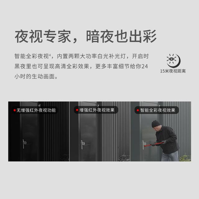 夜晚相对白天而言,更增添了某些危险到来的可能性,因此夜晚也就成了用户最关注的重点安防时段,在夜间同样能实现良好的安防效果,是摄像头重要的价值体现。W4 Max内置两颗大功率白光补光灯,配合专业级光学透镜,进光量更多,夜视通透性更强。开启时,夜视环境下,依然可以呈现彩色清晰画面。