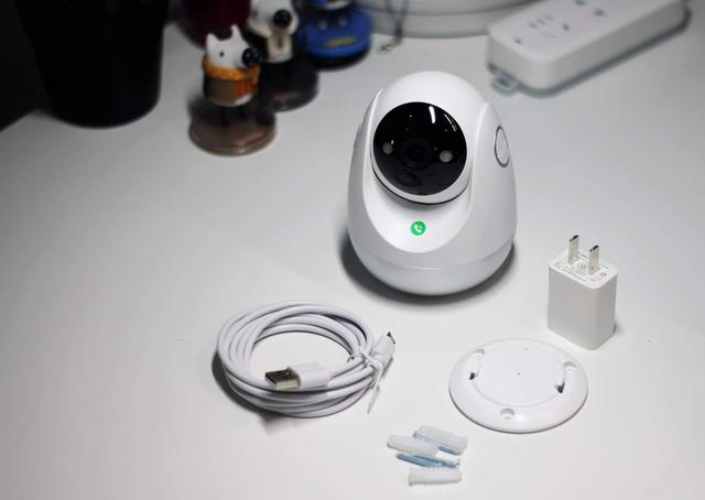 随机自带的配件也比较全,除了有充电头和一根很长的充电线之外,还有底座和三颗螺丝(配膨胀螺栓),无论是简单地摆放安装,还是用壁挂合作支架固定在墙上或者天花板上都是很容易的。