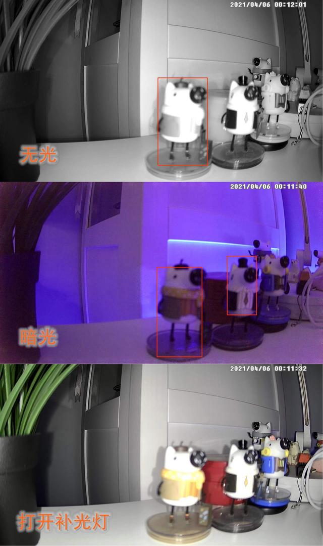 作为对比,我们可以看到摄像机在无光环境下会自动切换到黑白画面,虽然色彩确实少了,但清晰度还是不错的。如果有一定的光线,摄像机会自动切换到彩色显示,不过弱光下确实画质有一定损失。这时,我们可以打开摄像机上的这2颗补光灯,那么画质就和白天的区别不大了。所以这款摄像机的使用场景还是非常广的,自带补光灯也是一大亮点。