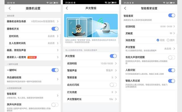 在APP的设置中可以对摄像机进行功能打开和关闭,比如在画面、夜视及声音设置中可以打开夜视模式,它在光线较暗时就会自动打开补光灯!比如开启声光报警,当有人出现在安全区域时,摄像机就会自动发出声音或者白光闪烁提示,有效防范安全隐患。还有很多功能都挺实用,比如人脸识别,智能人形过滤等等,看个人需求来打开或关闭!