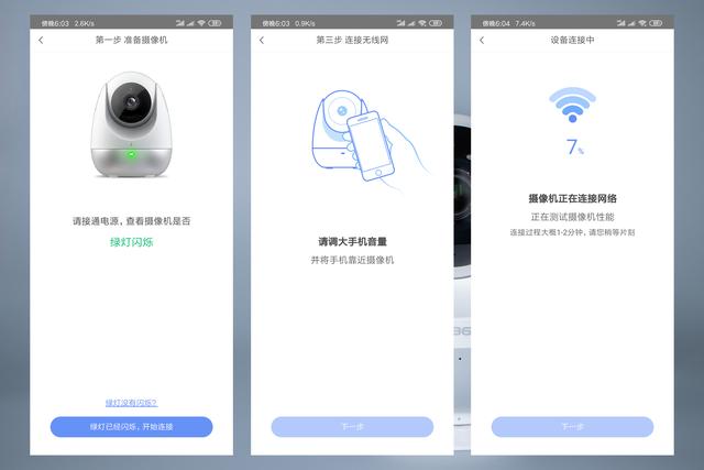 当然,在使用之前得让摄像机与手机相连,连接很便捷,只需下载一个“360摄像机”的APP,进入后根据提示就可完成连接,仅需三步就能设置完成,完全没有上手难度。