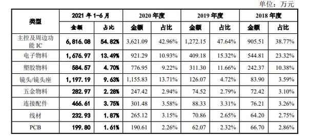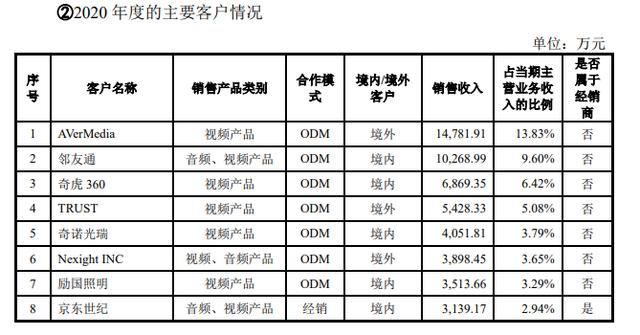 作为目前第一大客户,2018年至2021年上半年,AVerMedia(圆刚科技)向奥尼电子采购的产品均为PC/TV摄像头,交易额分别为36.25万元、230.41万元、1.48亿元和1065万元。
