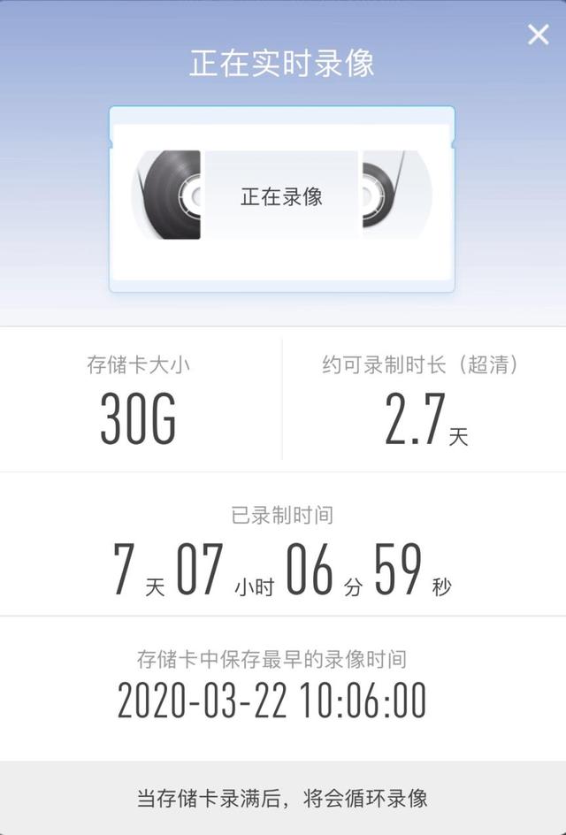 录像方面,360智能摄像头红警版支持两种录像模式,一是购买360云存储,可以自动保存到360云空间;另外一种是TF卡存储模式,以我的32G储存卡为例,1080P模式可录7天左右(图上显示最早录制时间在7小时前),自动覆盖之前的内容,720P模式可录取18天左右。建议大家还是开启1080P模式,保证画面质量,视频内容你也可以选择时间段自行保存。