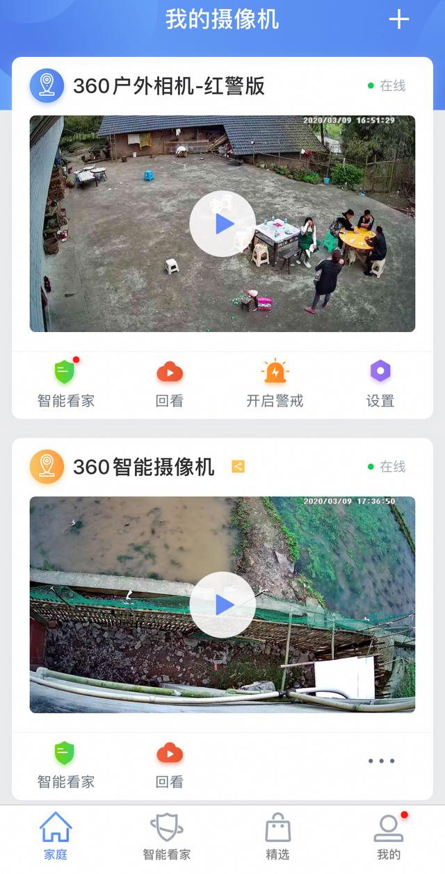 进入卡片页面—看家页面,会记录人物进入360智能摄像头红警版取景范围时的5秒画面,方便快速的查看。操作页面可以回看录像,设置画面画质,邀请其他家人一起查看,录像,静音,以及人形识别。