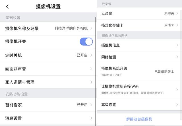 功能方面,像智能看家,主动警戒,定时开关机,人形过滤,消息设置,云录像,储存卡,系统升级,红外夜视,网络监测等等,功能齐全。