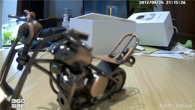 这张照片是极近焦条件下拍摄的画面截图,画面中的摩托车摆件前轮基本就贴着摄像头!可以看出,这款摄像头最近焦距大概在20cm左右开始至无穷大,因此,20cm后的画面细节可以充分捕捉!同时色彩还原度比较真实!