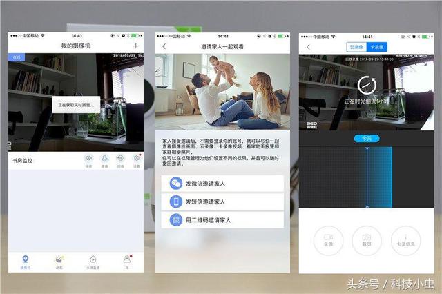 主界面设定常用功能,获取实时画面可以将主页面换成当前监控页面!邀请功能则可以将自己的摄像头分享给家人或者朋友,同时赋予不同的权限!而回看功能,相当于监控录像机的功能,回看过去一段时间的视频,家中有宠物的有福了!不过需要说明的是,回看功能分为云回看和卡回看两种模式哦!当然从安全角度来看,云回看当然更有效!