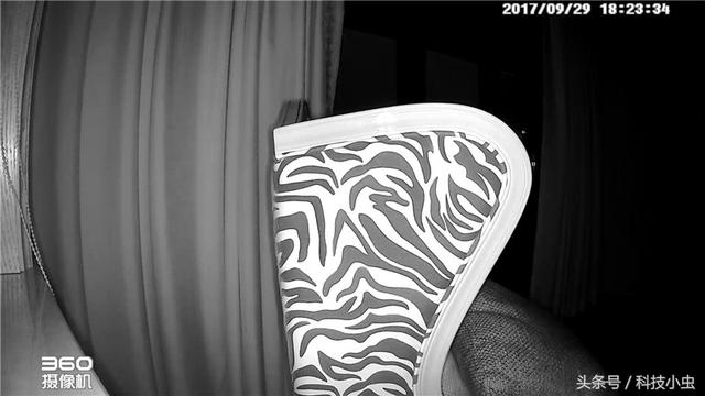 如此,在全黑的房间里面,抓拍了一个角落,摄像头与椅子的靠背距离大概1米,与窗帘的距离大概是2米。从这张照片看过来,虽然房间全黑,但是由于红外补光的原因,虽然物体均呈现为黑白色,但是照片细节还是非常容易辨认清楚的,甚至连椅子上面的靠垫的纹路都能看清楚,远处的窗帘也能清楚的看到其状态!