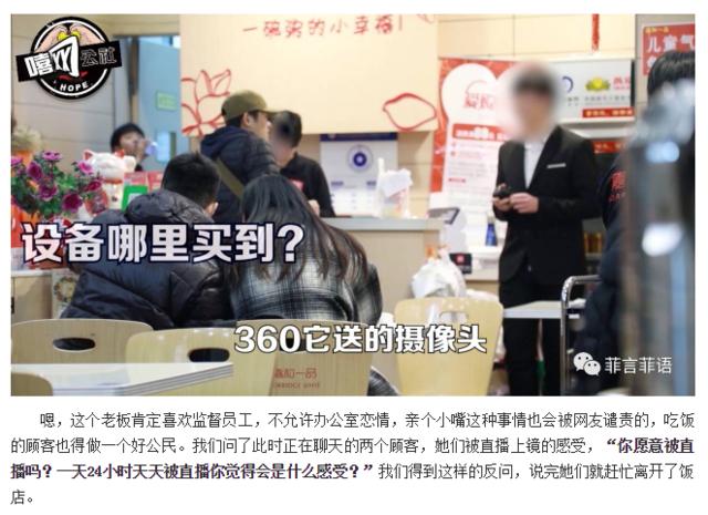 一切的改变,都因为一篇名为《一位92年女生致周鸿祎:别再盯着我们看了》而开始。在“菲言菲语”的笔下,360智能摄像机连同水滴直播,变成了“恶”的源头。文章中“菲言菲语”的工作人员顺着水滴直播的视频,找到了一系列的餐厅和健身房,并向在场工作人员和消费者询问是否知晓自己的日常已经被曝光在水滴直播上。显然,消费者得知自己的日常被曝光,成为了整篇文章的高潮点。