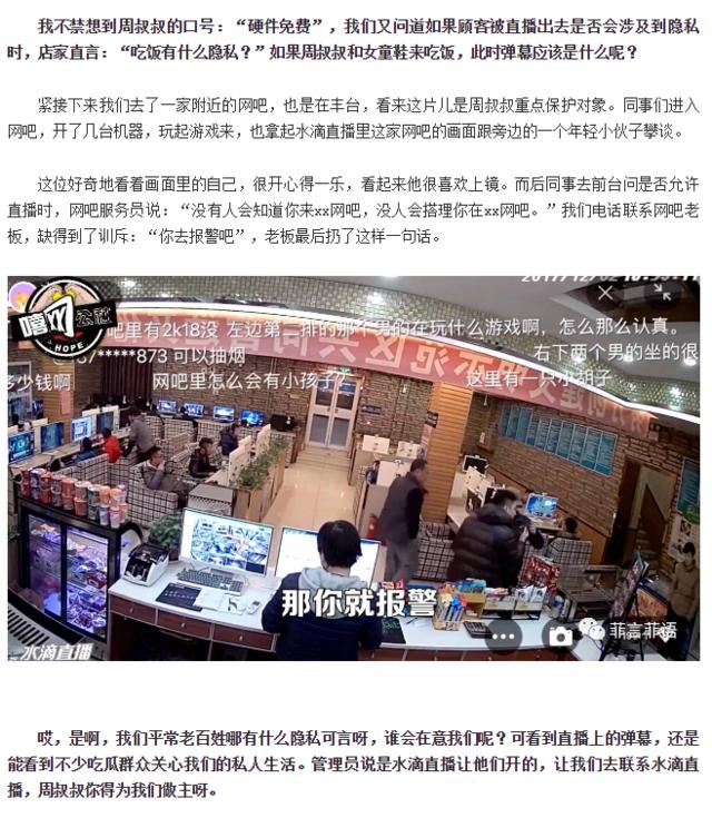 通读“菲言菲语”这篇文章后我们可以发现,他们的思路是先从平台上寻找受访对象,然后直接杀到线下,将情况揭露给不知情的被拍者。不得不说“菲言菲语”很是懂得如何创作一篇爆文,这种粗暴直接血淋淋的模式,很容易就可以调起公众的愤懑,让这股情绪直接冲着水滴直播和360去。也许是愤懑瞬间大于理智,读者在这个过程很容易忽略了一些值得思考的要点: