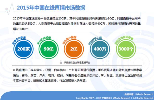报告中指出,2015年中国在线直播平台数量接近200家,其中网络直播的市场规模约为90亿,网络直播平台用户数量已经达到2亿,大型直播平台每日高峰时段同时在线人数接近400万,同时进行直播的房间数量超过3000个。这一系列让人心脏狂跳的数据,不仅满足了消费者的娱乐需求,更是让企业家和资本家兴奋不已。