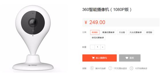 拥有众多升级功能的360智能摄像机1080P价格为249起。