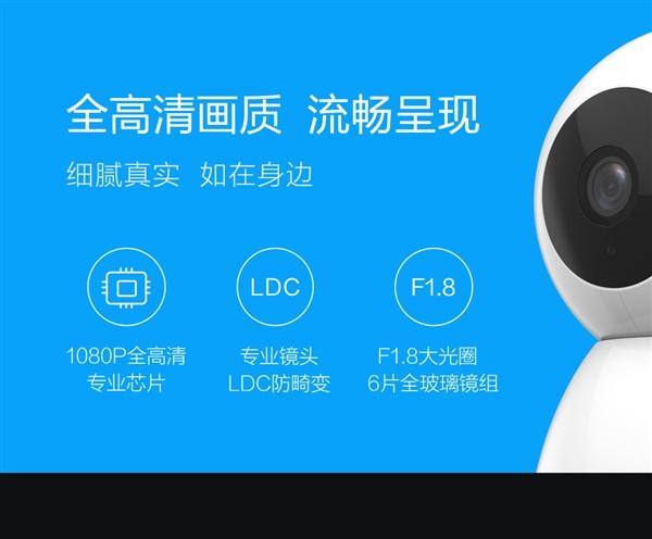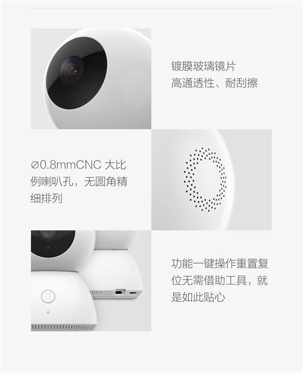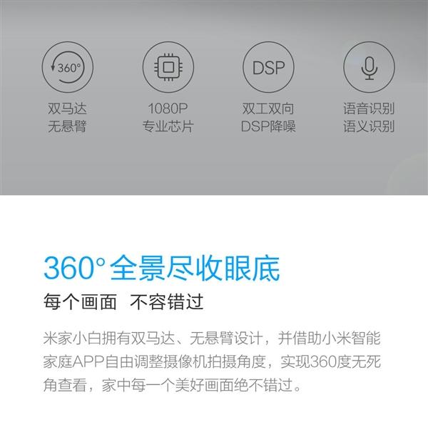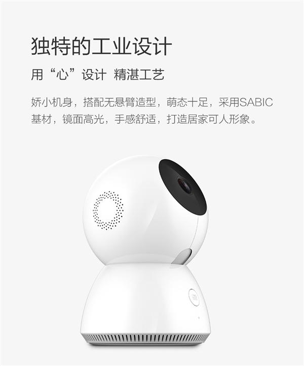 据悉,这款摄像机采用双马达无悬臂设计,支持360度旋转,能够借助小米智能家庭APP自由调整摄像机的拍摄角度,实现360度无死角查看。