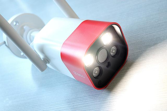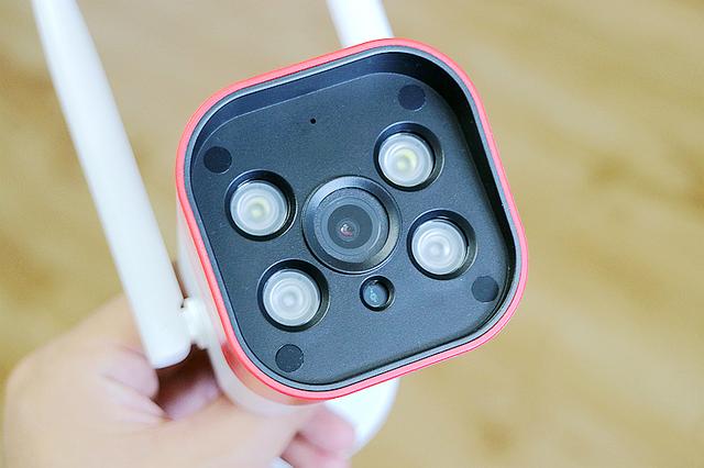 镜头上下两侧分别分布设计了高亮度补光灯和红外灯,其中补光灯可以在外界光线不足的情况下提供彩色的高清画面,而红外灯则通过发出人眼不可见的光线实现夜晚黑白画面的捕捉。