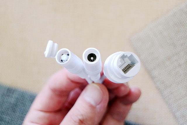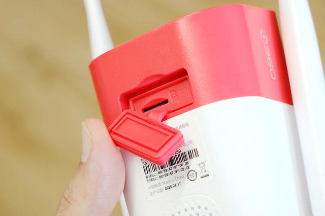 主机上最为显眼的便是像路由器一样的两根全向可调5dbi天线了,显然360摄像机红色警戒高配版本身支持无线图像传输,这在很大程度上减少了布线施工上的难度,并且较大的天线尺寸能够有效的增强室内和户外之间无线通讯的信号强度,保障图像传输的高速稳定。不过为了能够提供更为可靠和高速的数据传输模式,360摄像机红色警戒高配版同时还附带了RJ45接口用以支持网线连接,并且360还极为极致化的为产品的网络连接线端提供了防水帽,避免雨天沿线路爬水造成意外故障。