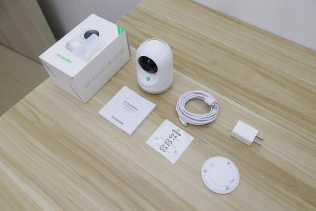打开包装以后,我们能够看到360智能摄像机云台5P 触联2K版一台,上墙底座 x1,定位贴纸 x1,数据线 x1,安装螺丝包 x1,电源适配器 x1,使用说明书 x1。