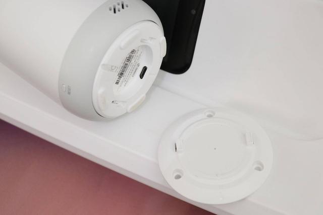 最后,我们再来看看看360智能摄像机云台5P 触联2K版的底部布局,超大的四枚滑脚垫,就算我们把设备放在光滑的桌面,也不会移位,滑落。影响设备美观的电源接口预留在底部,眼不见,心不烦,感觉贼合理。