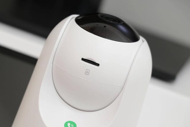 并且,在摄像头下方,我们还能看到一枚通话触控按键,只需触摸一下,即可与绑定APP的手机端进行视频通话,或者视频留言。这个功能对于有小孩和老人的家庭是刚需,就算没有电话,也能够实时对话。