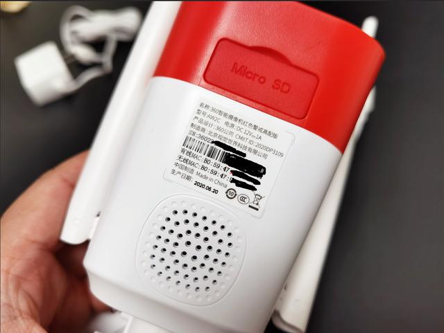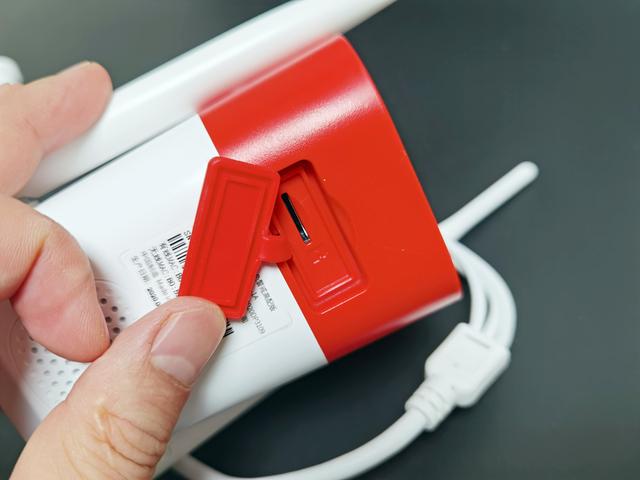 喇叭上方的红色防水设计的TF卡槽是一个Micro-SD卡槽,支持FAT32格式、class4以上的TF卡,最大容量达128GB,存储视频监控信息。