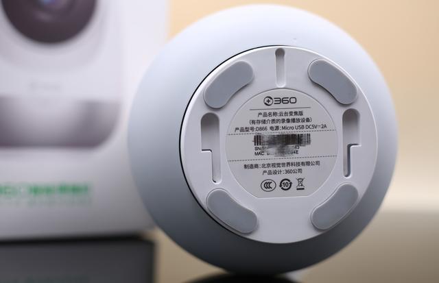 在360智能摄像机云台变焦版的的底部,除了中间的产品信息介绍之外,还对称式分布着四个防滑脚垫。因为产品除了像常规摄像头一样吊顶安装、支架壁挂安装之外,还可以直接摆放在桌面上。
