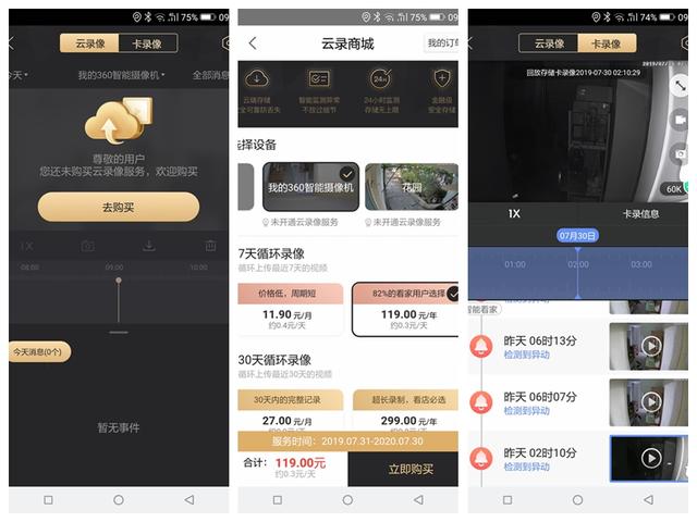 当然,除了这个还有回看的,回看同侦测不同,回看是连续的录像。回看可以有本地的存储卡(前面看过的,有卡槽),也可以同时选择购买云存储。本地存储和云存储各有利弊,也可以同时选择,看自己的需要吧。在回看画面,可以看到连续的时长,其中有红色竖条的,就是有看家事件发生的时段。