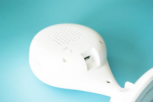底座背面有橡胶垫,圆圆的一圈,摄像头背面有复位按钮和散热孔,兼具喇叭。