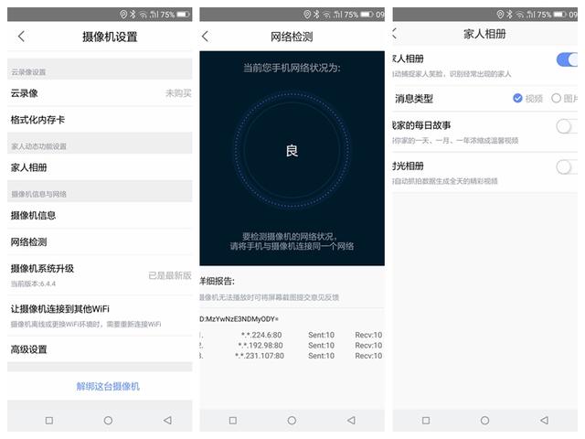 除了这个,还有其他的一些设置,比如看网络状态,譬如家人相册等等的高级功能。还具有人在家自动关闭摄像头的功能,就是可以设置当你的手机和摄像头在同一个局域网的时候,就自动关闭摄像头。