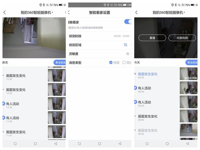 这里的我的看家,是360摄像机常用到的功能,就是当监测画面发生变化的时候,自动的开始录像。会有画面的列表,可以选择需要观看的画面。侦测的时间和区域、灵敏度都可以设置。