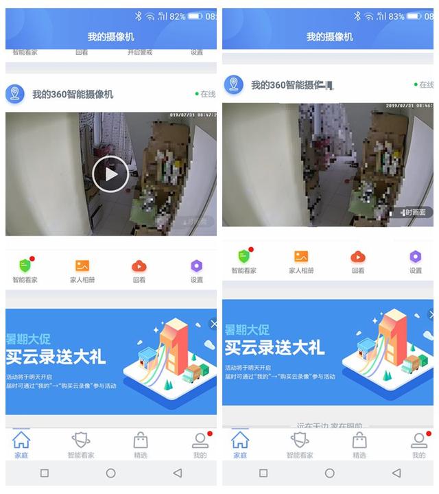 点击右侧的箭头,画面上移,下方会出现历史的活动信息,就是画面内有物体移动,就会自动记录下来,方便查看。这个就是下方蓝色的看家界面,而点击右侧的操作,可以看到有回看、设置、清晰度、邀请家人,甚至还有儿歌,就是播放儿歌的功能,自然是给小孩听了。