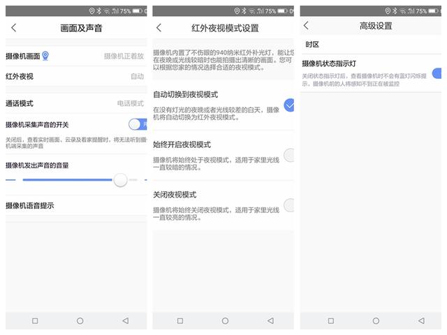 在设置里,可以选择摄像头是正着放还是倒着悬挂,可以设置摄像头发出声音的音量,可以设置是不是采集声音,还有红外夜视的设置,可以设置为自动,也可以手动设置。还可以设置状态指示灯是不是开启,这个指示灯是什么呢?就是下面这个。