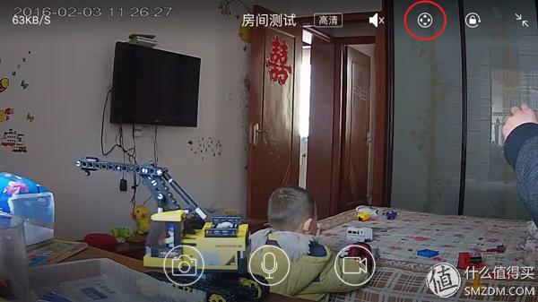 轻触屏幕后,屏幕区域还有功能键,红圈内的那个键是控制云台的,左右可转动355°,上下可转动90°,也差不多算全景监控了