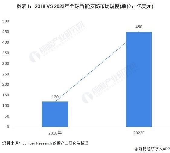 总体来讲,全球安防市场规模庞大,市场领域和市场类型不断成熟,供应商不断向低成本地区转移,客户也稳步增长。随着智能技术的发展,智能安防也日渐成规模化发展。根据Juniper Research的研究报告数据显示,全球智能安防市场规模将从2018年的120亿美元增长到2023年的450亿美元,年复合高达30.26%。
