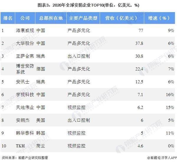 按照2019年的营收排名,2020年全球安防50强前十位分别为:海康威视、大华股份、亚萨合莱、博世、安讯士、宇视科技、天地伟业、安朗杰、韩华Techwin、TKHGroup。国内企业海康威视、大华股份依然稳居第一、第二的位置,销售收入远超其他公司,均主打产品多元化;除了海康威视和大华股份,国内企业宇视科技、天地伟业同样位于前十行列,名次也略有上升,分别排名第六位和第七位,宇视科技同样主打产品多元化,而天地伟业主打视频监控。