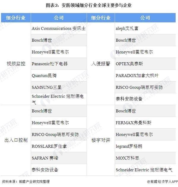 安防产业领域庞大,具有视频监控、出入口控制与管理、入侵报警、楼宇对讲等众多细分行业。数据显示,2019年全球安防产业总产值达到3600亿美元(约合25400亿人民币),2023年智能安防行业规模将达450亿美元,巨大市场机遇吸引无数企业竞相争夺,在每个细分行业均有不同的企业竞争,而各个安防企业在各细分行业的竞争优势不尽相同。视频监控领域有Axis Communications 安讯士、Bosch博世、Honeywell霍尼韦尔等企业;出入口控制有Bosch博世、Honeywell霍尼韦尔、RISCO Group瑞思可安防等。