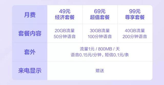 - 经济套餐:49 元/月,套餐内包含 20GB 流量、50 分钟语音