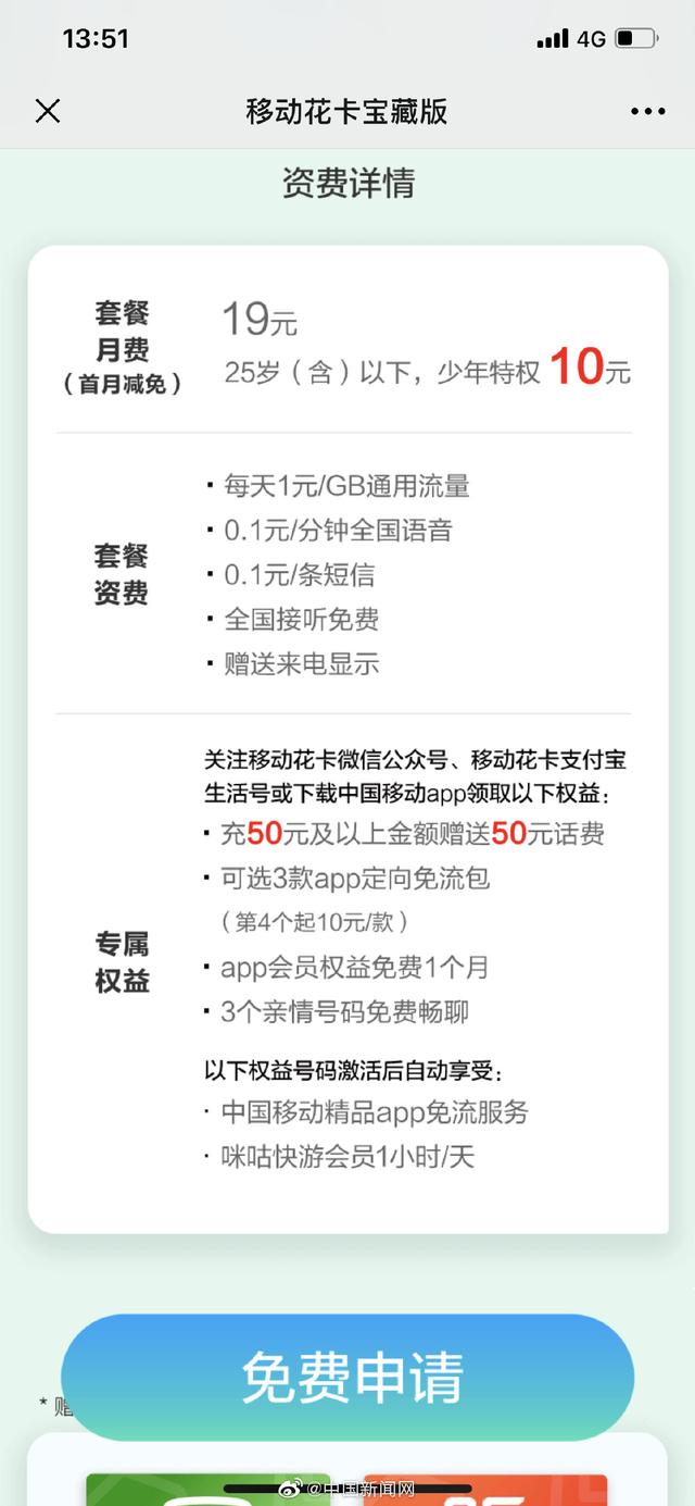 据介绍,使用该电话卡的25周岁以下客户,自动享受月费优惠价10元/月;25周岁以上,套餐月费19元。套餐资源包括国内流量每天1元1GB,不使用不收费;3个亲情号免费畅聊。