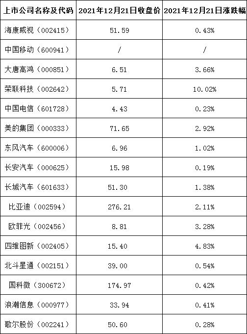 在联盟官网查询,成员由下图所示,涉及到的A股上市公司有:高鸿股份、荣联科技、四维图新、欧菲光、歌尔股份、国科微、北斗星通、浪潮信息、长安汽车、东风汽车、长城汽车、比亚迪、中国移动、中国电信、海康威视、美的集团等等。