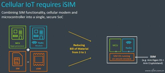 其中,iSIM卡的概念比较新,它最早是由ARM在2018年初提出的概念,并被命名为“Kigen”嵌入式方案。我们可以将该方案理解为将射频模块以及SIM模块直接集成进SoC芯片,无需安装物理SIM卡和额外的安全芯片就能随时联网,同时还能减少企业生产所需的成本(完全无需卡槽等额外的硬件,由处理器安全模块“软硬模拟”)。