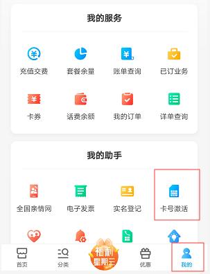 第一步:进入中国移动APP,点击右下角"我的"之后,即可在"我的助手"中找到"卡号激活",另外用户也可以在APP首页搜索"卡号激活"进入卡号激活页面。