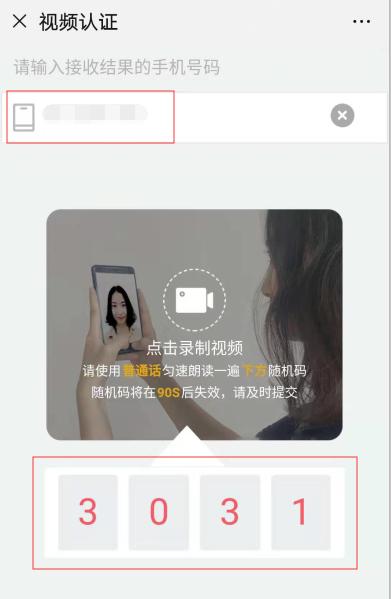 第三步:视频认证,输入需要接收结果的手机号码,并且录下用普通话匀速读一遍下方随机码的视频,等候系统通过验证即可。